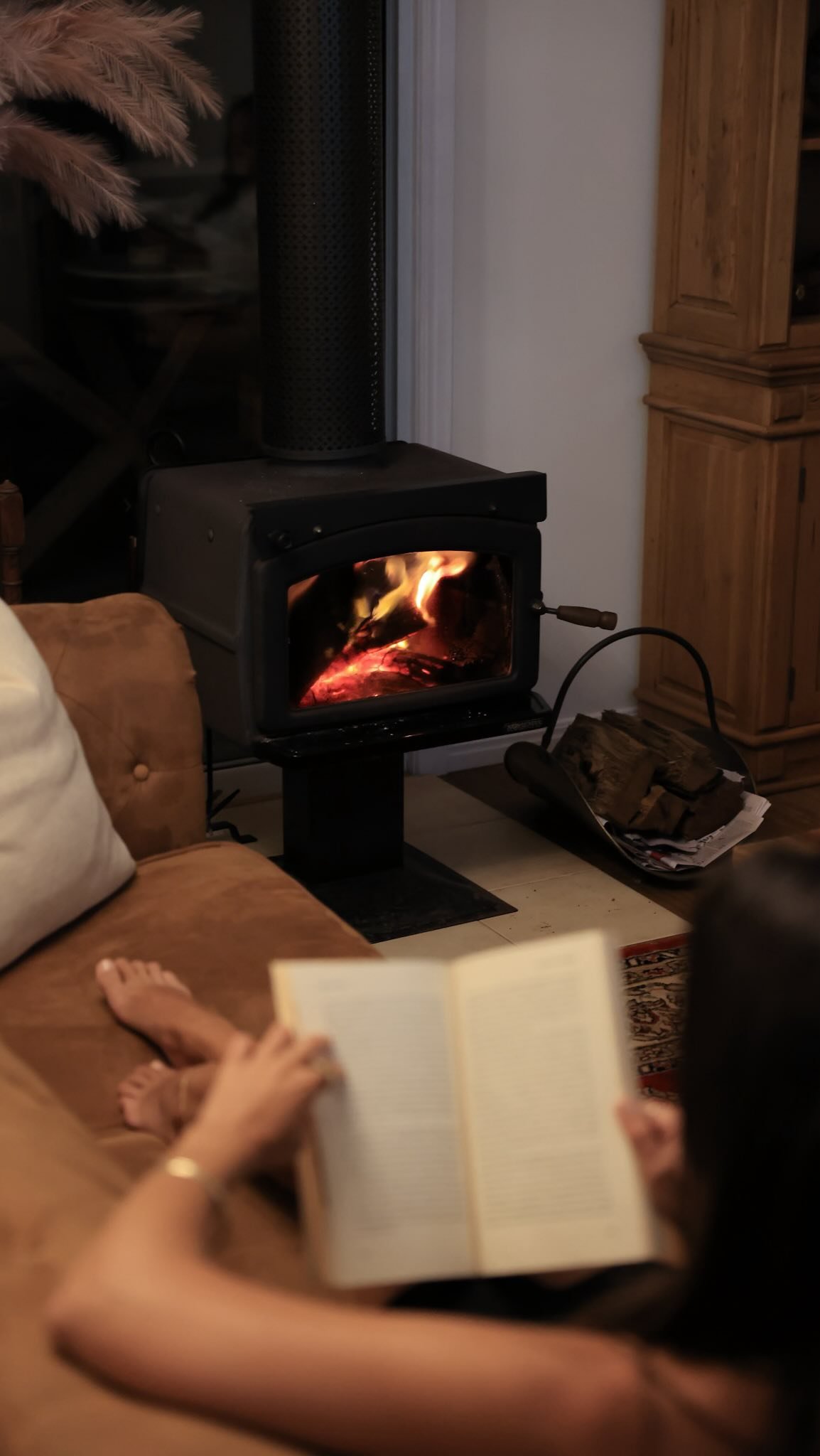 Cozy living room with tan sectional sofas, a wood coffee table with candles, a wood bookshelf with decorative items, a wood stove with a chimney pipe, and windows with plantation shutters, in a sunlit room.